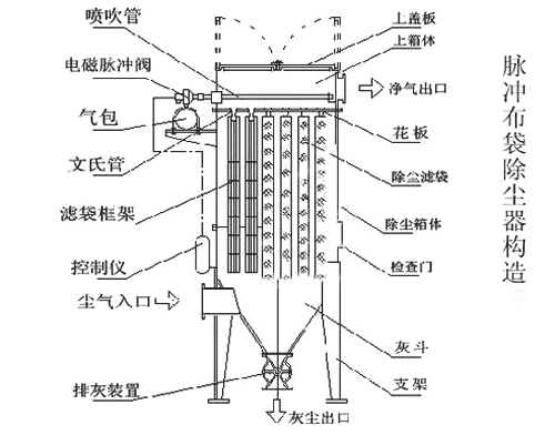 脈沖袋式除塵器的結構圖可以了容易了解它的結構由哪些部分組成: